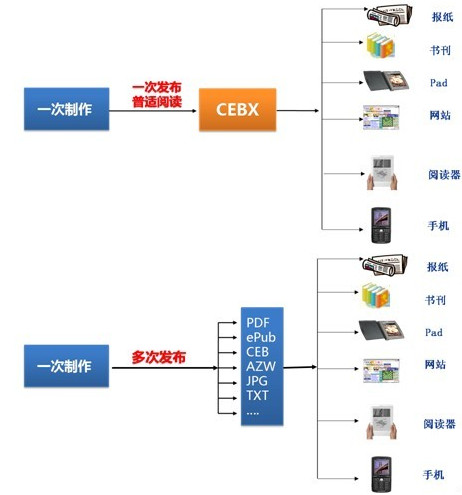 這對比以往出版社為滿(mǎn)足印刷紙報、紙書(shū),滿(mǎn)足手機PAD等移動(dòng)應用,需要將制作文件多次排版,以便多次發(fā)布成PDF、EPUB、AZW等格式,CEBX格式的出現,將會(huì )極大地節省出版社的人力成本和時(shí)間成本。