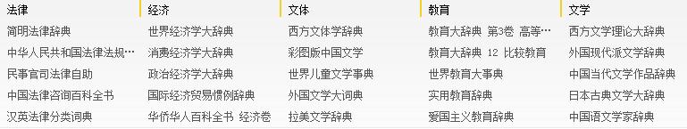 主要收錄國內各大出版社各個(gè)領(lǐng)域的權威工具書(shū),目前已經(jīng)收錄了《中國大百科全書(shū)》、《漢語(yǔ)大詞典》、《辭?!返葯嗤ぞ邥?shū);